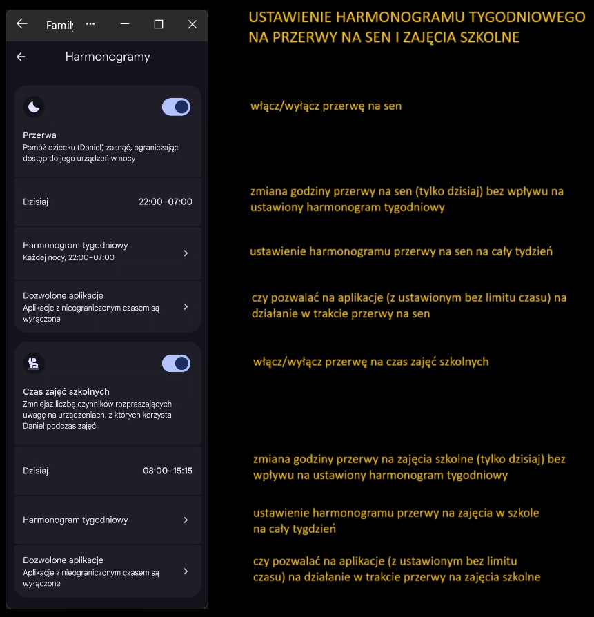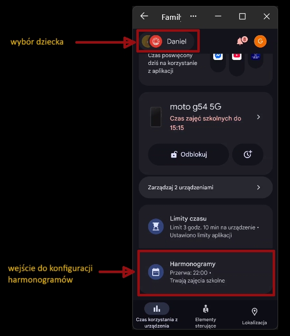 Harmonogramy ustawiamy względem dziecka na wszystkie urządzenia jednocześnie